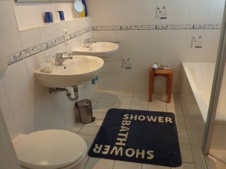 | Badewanne, Dusche, 2 Waschbecken und ein WC |